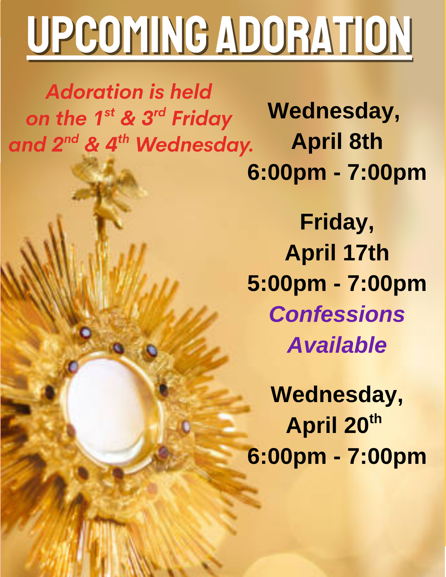 1st and 3rd Fridays of the month (w/ confessions):